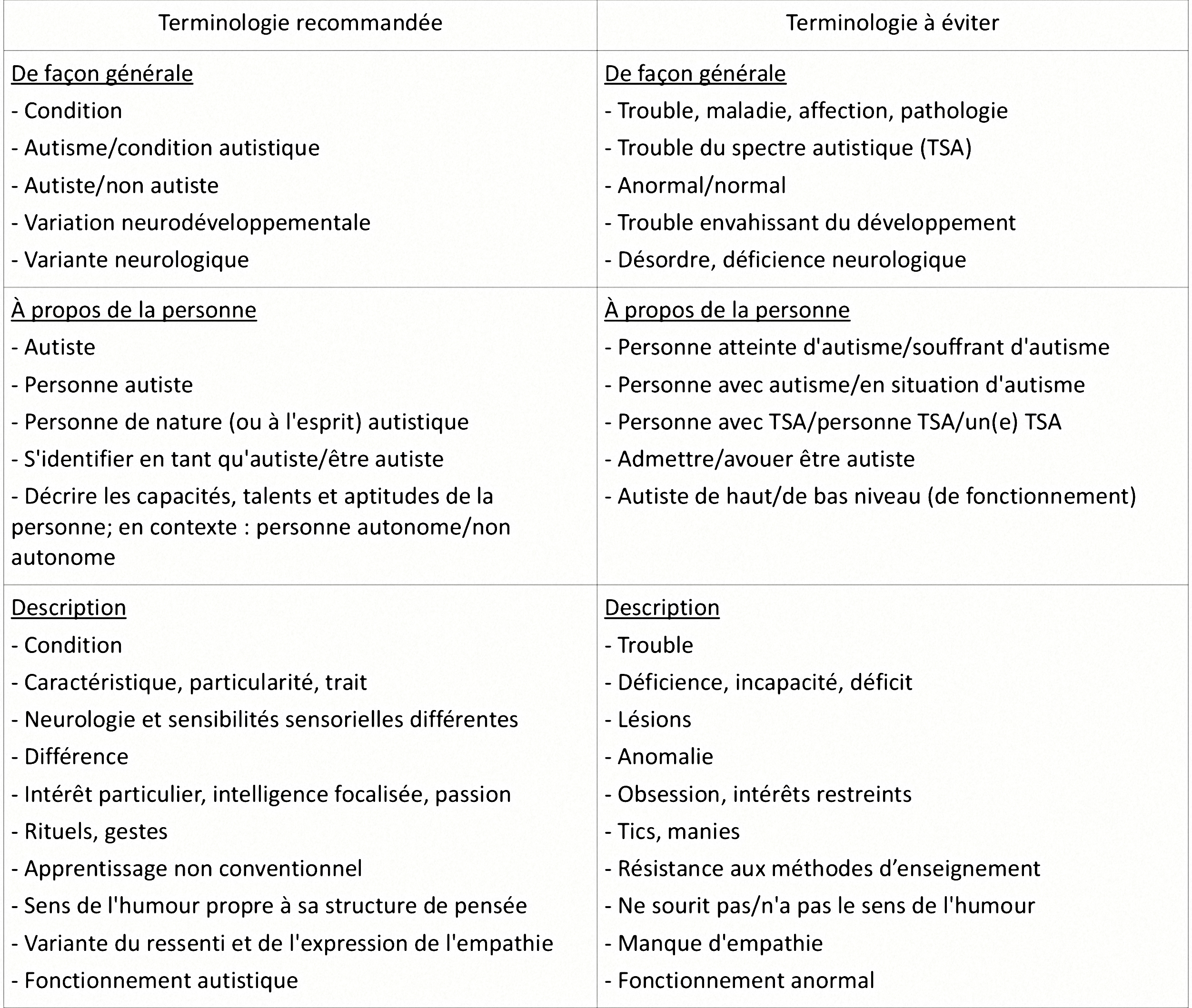 – Éviter de généraliser. Faire référence à la diversité des personnes autistes et à la neurodiversité humaine.