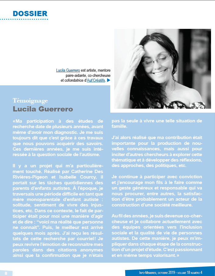 L’expérience de participante pourrait nous marquer positivement. À ce propos, il y a un projet qui m’a particulièrement touché. Une étude réalisée par Catherine Des Rivières Pigeon et Isabelle Courcy sur les tâches quotidiennes des parents d’enfants autistes. À l’époque, je traversais une période difficile en tant que mère monoparentale d’enfant autiste avec la solitude et le sentiment de vivre des injustices. Dans ce contexte, le fait de participer était pour moi une manière d’agir et de dire : «?voici ma réalité que personne ne connait?». Ça fait du bien quand on se sent écouté.