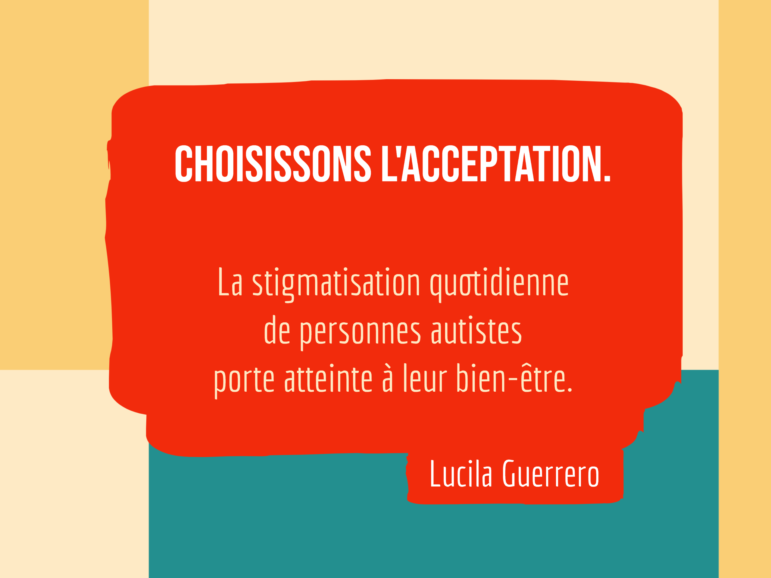 Ce n’est pas tout! Des gens parlent aussi de traitements, de normalisation, de punitions, d’eau de javel et de dépistage prénatal. De vaincre l’autisme. De le détruire. De combien nous pouvons être indésirables… la liste est longue. Cette vision de l’autisme, basée sur les déficits, est à l’origine de la stigmatisation.