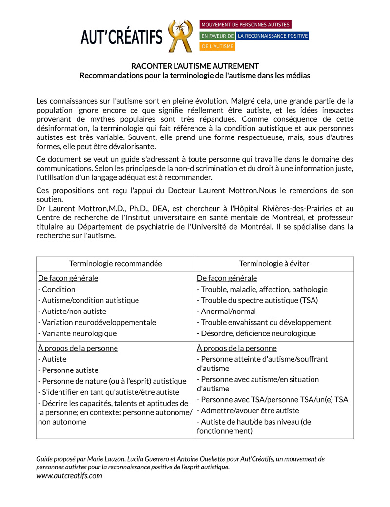 Les valeurs de l’organisme se retrouvent dans le Manifeste et le document Raconter l’autisme autrement (code de terminologie).