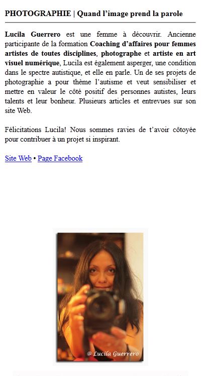 Entrevues pour les médias en tant qu’artiste et militante autiste.