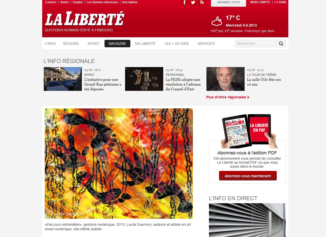 – Le journal La Liberté à Fribourg (Suisse), a publié dans son édition du mercredi le 5 juin 2013 (version papier et PDF) une photographie de mon œuvre « Parcours entremêlés »